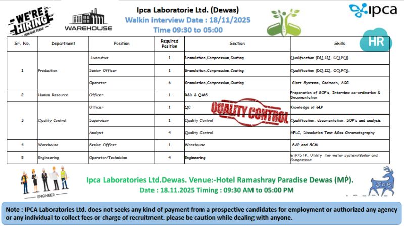 Ipca Laboratories Ltd. is a reputed pharmaceutical manufacturer known for its strong manufacturing excellence, quality culture, and global regulatory compliance. The Dewas facility is expanding its team across Production, QA, QC, HR, Warehouse, and Engineering departments.