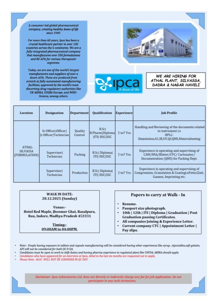 Ipca Laboratories Ltd is conducting a walk-in interview for experienced professionals at its Athal (Silvassa) formulation plant. Eligible candidates from Quality Control, Packing, and Production departments are invited to attend this hiring drive.