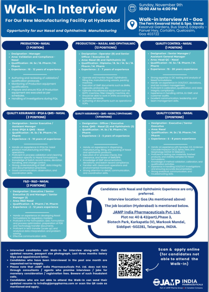 JAMP India Pharmaceuticals Pvt. Ltd. is hiring for its new manufacturing facility at Hyderabad. The company is looking for experienced professionals in Nasal and Ophthalmic Manufacturing across various departments.