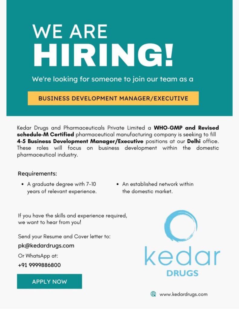 Kedar Drugs and Pharmaceuticals Pvt. Ltd. – Hiring for Business Development Manager/Executive