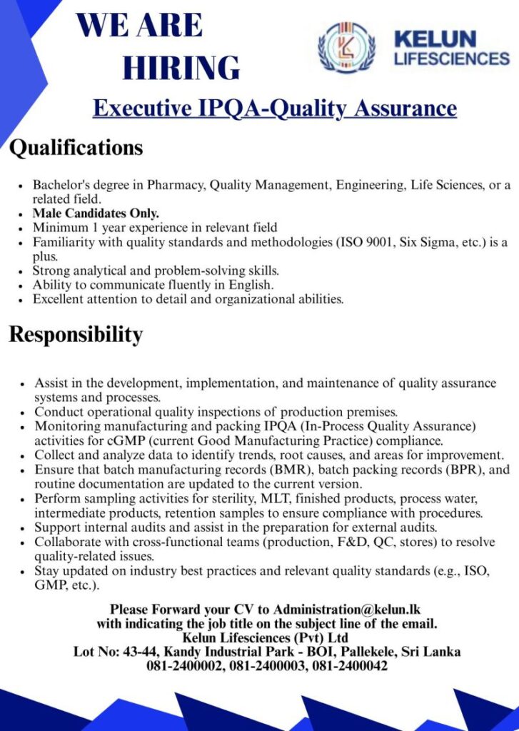 Kelun Lifesciences (Pvt) Ltd is inviting applications for the position of Executive – IPQA (In-Process Quality Assurance) at their Pallekele, Sri Lanka facility.