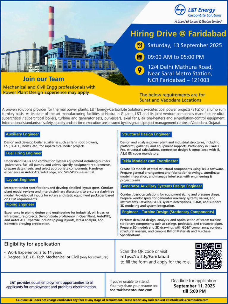 L&T Energy–CarbonLite Solutions, a brand of Larsen & Toubro Limited, is conducting a Hiring Drive at Faridabad for engineering professionals. The openings are for Surat and Vadodara locations. Candidates with Power Plant Design Experience are encouraged to apply.