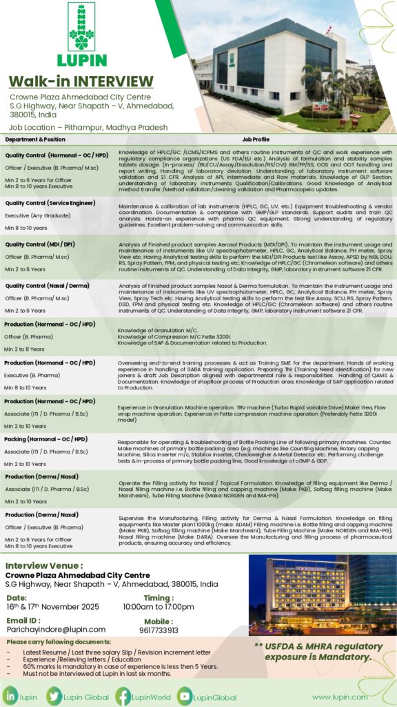Role: Handling HPLC/GC/LCMS/ICPMS, stability samples, method validation, analytical data review, and documentation as per US FDA / EU regulations.