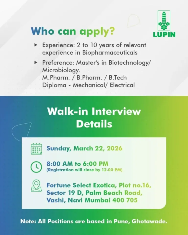 Lupin Limited – Walk-In Interview For Multiple Departments on 22 March 2026