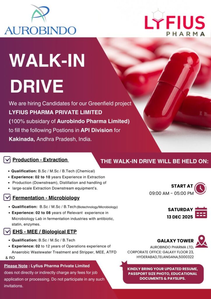 Lyfius Pharma Private Limited, a 100% subsidiary of Aurobindo Pharma Limited, is a rapidly growing pharmaceutical organization focused on high-quality Active Pharmaceutical Ingredient (API) manufacturing. As part of Aurobindo’s Greenfield project in Kakinada, Andhra Pradesh, Lyfius Pharma is expanding its operations and seeking experienced professionals for key technical roles. The company offers excellent career growth opportunities in a modern and innovation-driven environment.