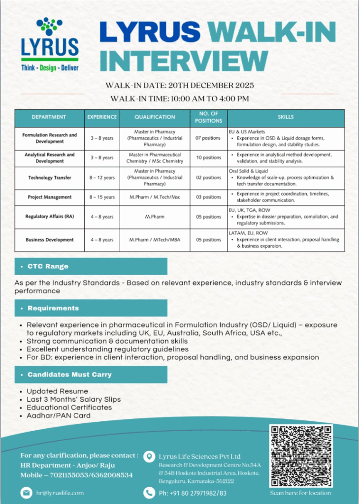 Lyrus Life Sciences Pvt Ltd is a fast-growing pharmaceutical research and development organization specializing in formulation development, analytical research, regulatory affairs, and technology transfer. The company serves regulated global markets including the EU, US, UK, ROW, and LATAM. Lyrus is known for its strong scientific expertise, regulatory compliance, and end-to-end product development capabilities.