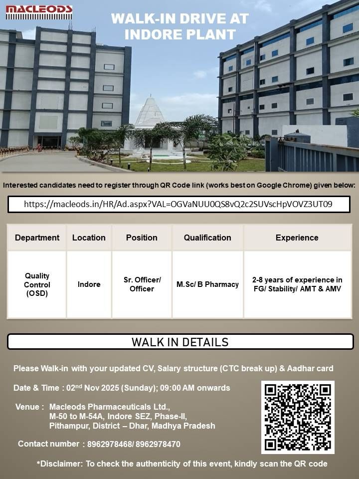 Macleods Pharmaceuticals Ltd, one of India’s leading pharmaceutical companies, is conducting a walk-in drive at its Indore Plant for the Quality Control (OSD) Department. The company is known for its strong global presence and high-quality products across multiple therapeutic areas.