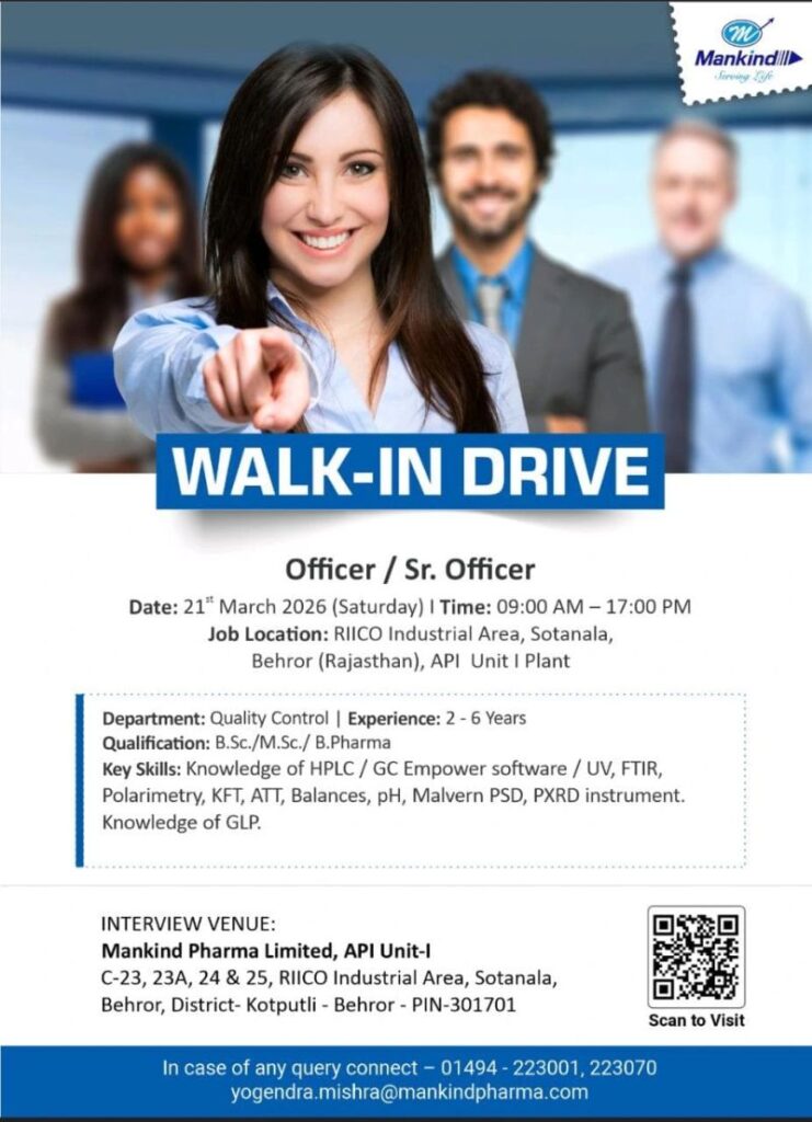 Mankind Pharma Limited is conducting a walk-in drive for Quality Control professionals at its API Unit in Behror (Rajasthan). This is a great opportunity for candidates with relevant experience in QC and analytical instruments to join one of Indiaโs leading pharmaceutical companies.