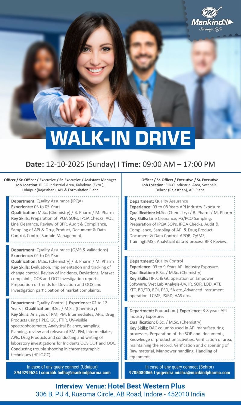 Mankind Pharma is one of India’s leading pharmaceutical companies dedicated to providing quality healthcare products and improving lives. With a strong presence in domestic and international markets, Mankind continues to expand its team with skilled professionals in the API and Formulation divisions.