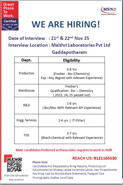 MSN Laboratories Pvt. Ltd is one of India’s fastest-growing pharmaceutical companies with strong expertise in APIs, formulations, and research-driven development. With world-class facilities, advanced R&D capabilities, and a strong global footprint, MSN offers excellent career opportunities for both freshers and experienced professionals across manufacturing and technical departments.