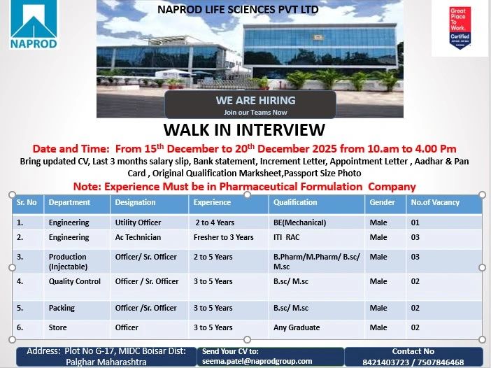 Naprod Life Sciences is a leading pharmaceutical formulation company known for its high-quality oncology and critical-care products. The organization is expanding its team and inviting experienced professionals for multiple vacancies across Engineering, Production, Quality, Packing, and Store departments.