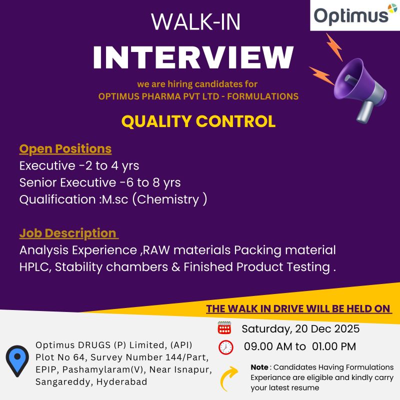 Optimus Pharma Pvt. Ltd – Walk-In Interview For Quality Control (Formulations) on 20 December 2025