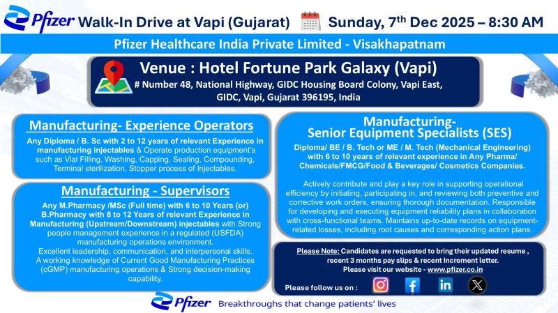 Pfizer is one of the world’s leading pharmaceutical companies, committed to innovation, quality, and global healthcare excellence. With a strong presence in India, Pfizer Healthcare focuses on advanced manufacturing, reliable quality systems, and world-class injectable operations. This walk-in drive is being conducted to hire experienced professionals for its manufacturing operations.