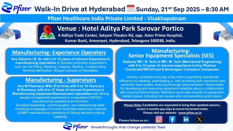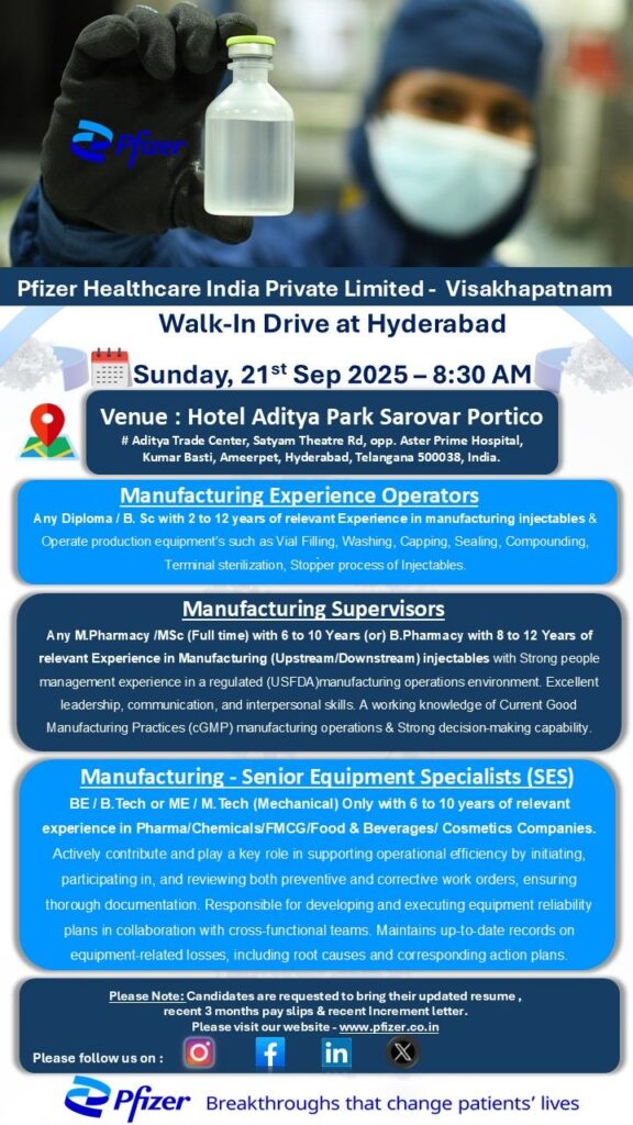Pfizer Healthcare India Pvt. Ltd (Visakhapatnam) is conducting a Walk-In Drive for multiple positions in Manufacturing and Engineering departments.