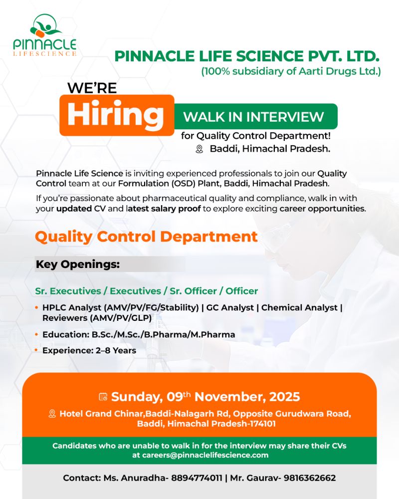Pinnacle Life Science is inviting experienced professionals to join their Quality Control Department at the Formulation (OSD) Plant, Baddi.