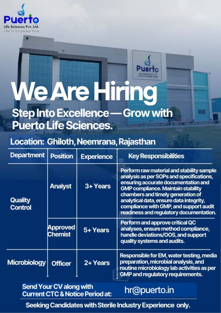 Puerto Life Sciences Pvt. Ltd. is a fast-growing pharmaceutical company committed to delivering high-quality, safe, and effective healthcare products. With a strong focus on GMP compliance, quality excellence, and innovation, the company operates a modern manufacturing facility and follows stringent regulatory standards to meet global requirements. Puerto Life Sciences offers a professional work environment with opportunities for growth and learning, especially for candidates from the sterile pharmaceutical industry.