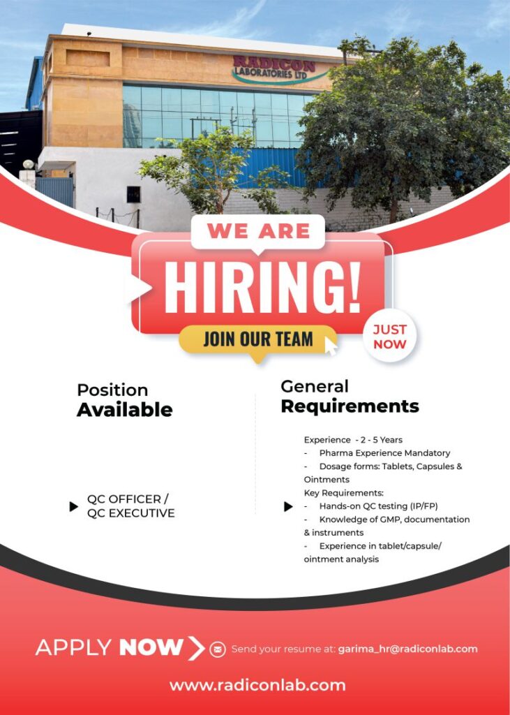 Radicon Laboratories Ltd is a reputed pharmaceutical formulation company known for manufacturing high-quality tablets, capsules, and ointments. With a strong focus on GMP standards, quality systems, and regulatory compliance, the company offers excellent career opportunities for experienced QC professionals aiming to grow in a respected pharma environment.