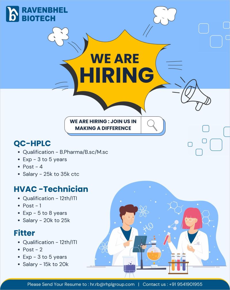 Ravenbhel Biotech is expanding its team and inviting skilled professionals to join its operations across QC, technical and engineering functions. The company is committed to high-quality pharmaceutical manufacturing, strong compliance standards and continuous process improvement.