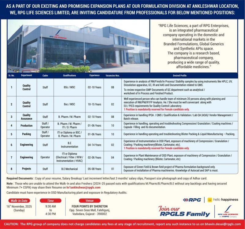 RPG Life Sciences Limited is conducting a Walk-In Interview at its Formulation Division, Ankleshwar, for multiple positions in various departments as part of its expansion plans.