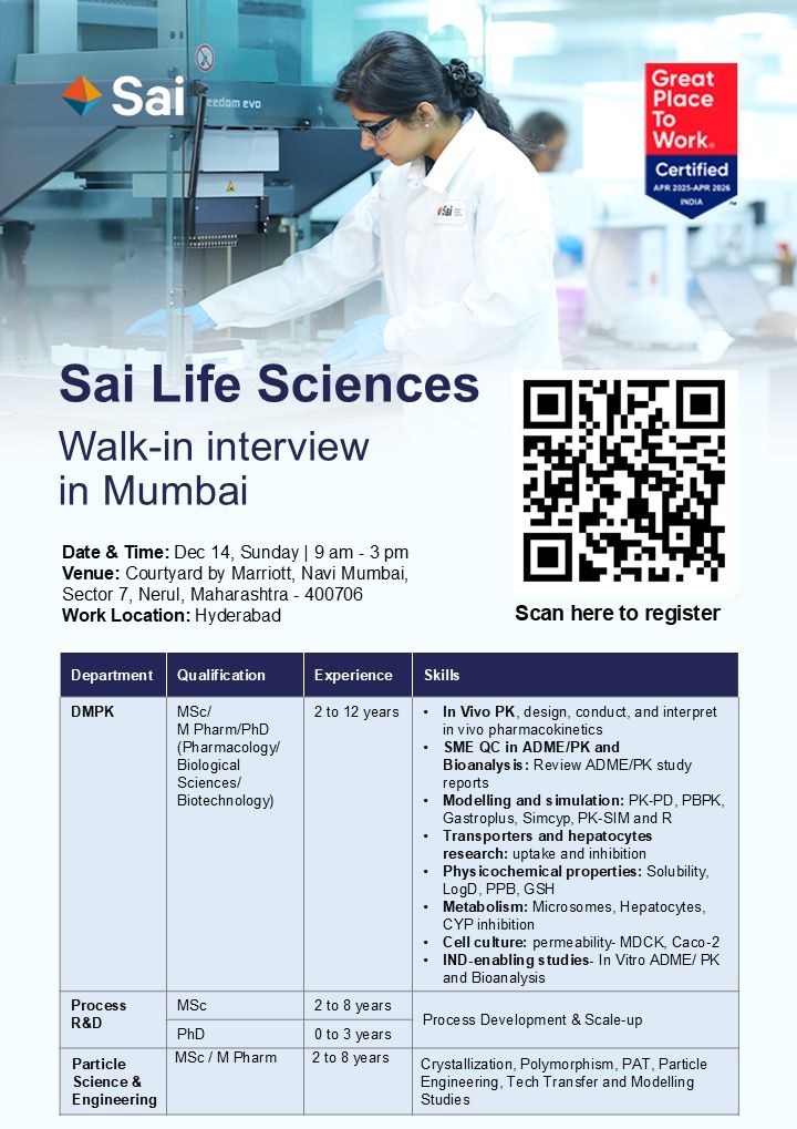 Sai Life Sciences is a leading global contract research, development, and manufacturing organization (CRDMO) that partners with innovator pharma and biotech companies worldwide. Certified as a Great Place to Work, Sai Life Sciences is known for its strong scientific expertise, innovation-driven culture, and employee-focused work environment. The company offers excellent career growth opportunities in discovery, development, and process sciences.