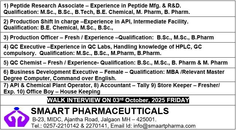This walk-in interview aims to attract skilled candidates and fresh graduates who are passionate about building a career in the pharmaceutical industry. Smaart Pharmaceuticals offers a dynamic work environment, competitive opportunities, and exposure to advanced technologies in pharmaceutical manufacturing and quality practices.