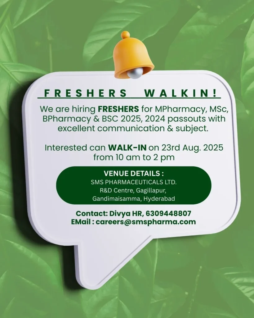 SMS Pharma – Walk-In Interview for Freshers on 23rd August 2025