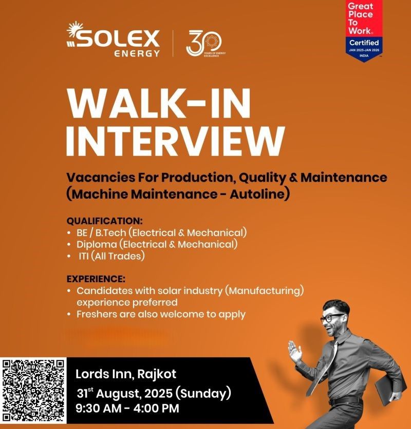 Solex Energy Ltd., a leading name in the solar energy industry, is conducting a Walk-In Interview for vacancies in Production, Quality & Maintenance (Autoline – Machine Maintenance). This is an excellent opportunity for both freshers and experienced candidates to join a reputed organization.