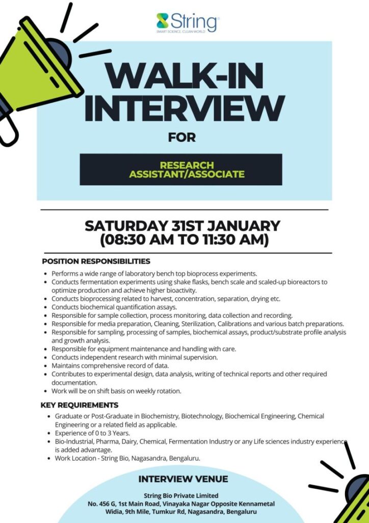 - Qualification: Graduate / Post-Graduate in Biochemistry, Biotechnology, Biochemical Engineering, Chemical Engineering, or related disciplines