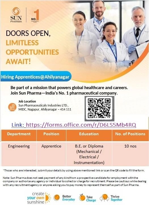 - Sun Pharma does not seek payment of any kind from a prospective candidate for employment.