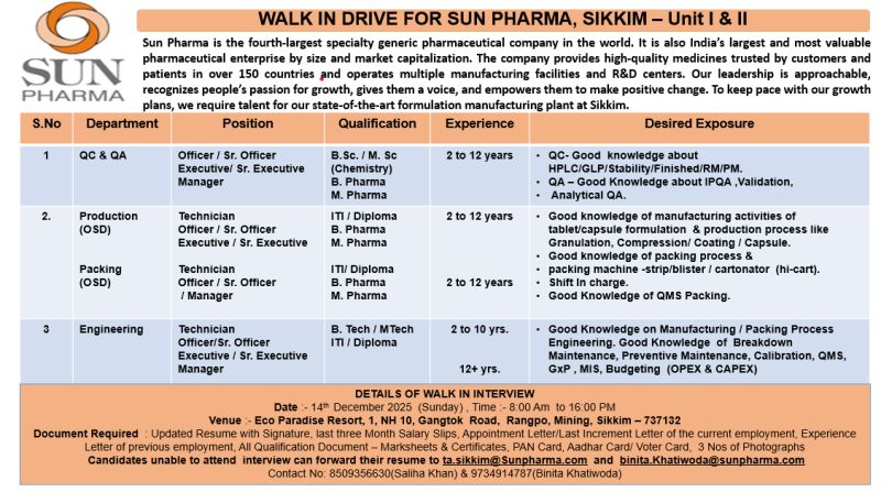 Sun Pharma – Walk-In Drive For QC, QA, Production, Packing & Engineering on 14 December 2025