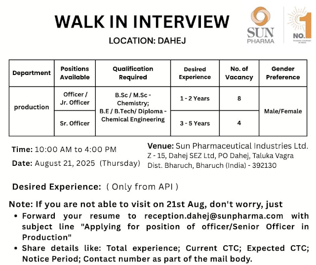 Sun Pharma, one of the leading pharmaceutical companies in India, is conducting a Walk-In Interview for Production roles at its Dahej facility. Candidates with API experience are preferred.
