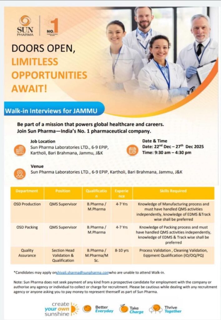 Sun Pharmaceutical Industries Ltd – Walk-In Interview on 22 to 27 December 2025