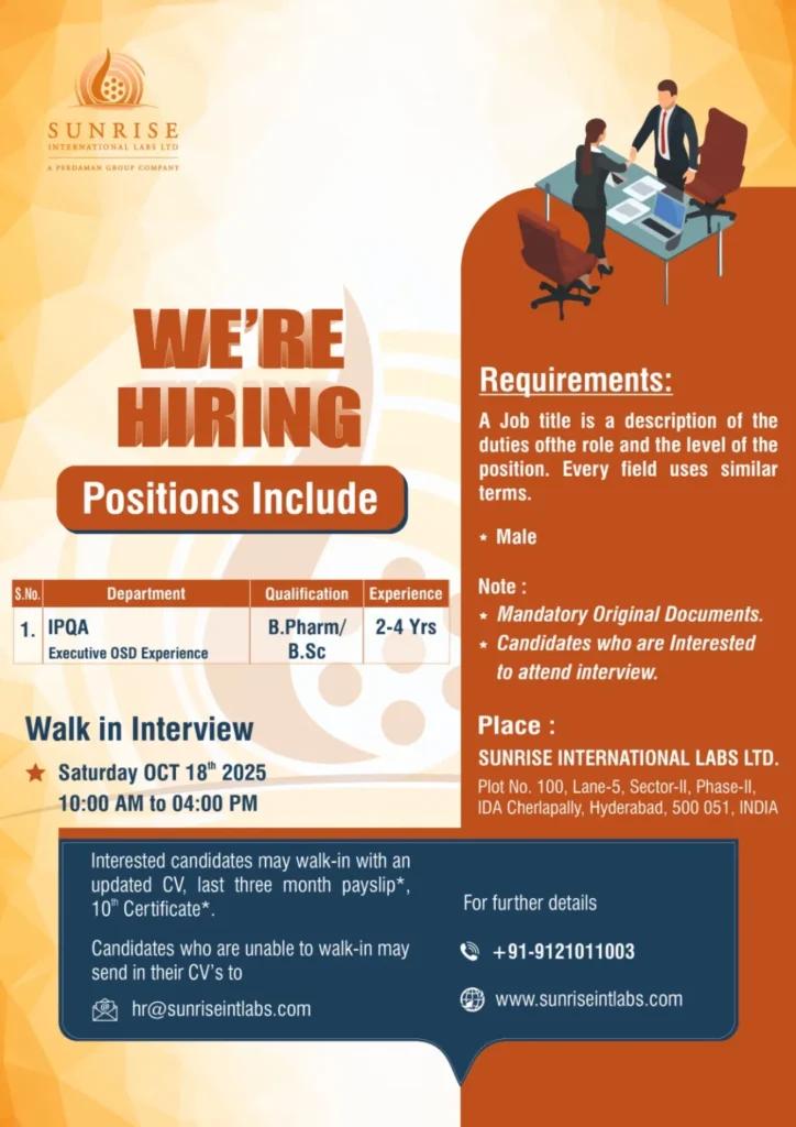 - Candidates unable to attend the walk-in may send their CVs to hr@sunriseintlabs.com