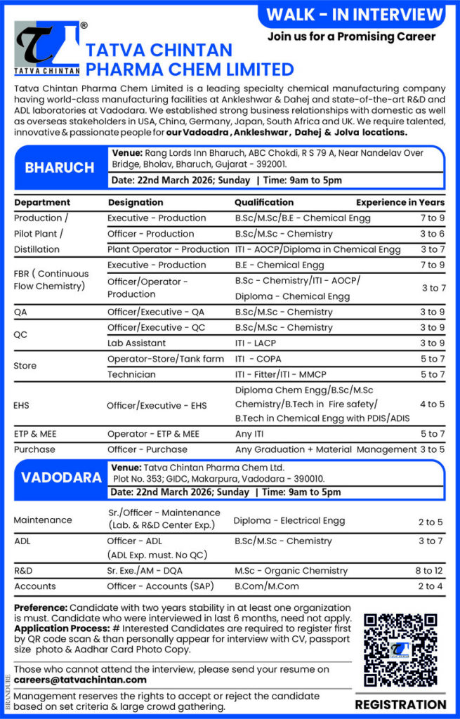 Candidates with relevant experience in chemical/pharma industry can apply.
