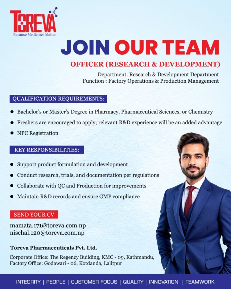 Toreva Pharmaceuticals Pvt. Ltd. is a leading pharmaceutical organization driven by the vision of delivering quality healthcare solutions that truly make a difference. With a strong commitment to innovation, quality, and compliance, Toreva continues to expand its R&D and manufacturing capabilities to meet global standards.