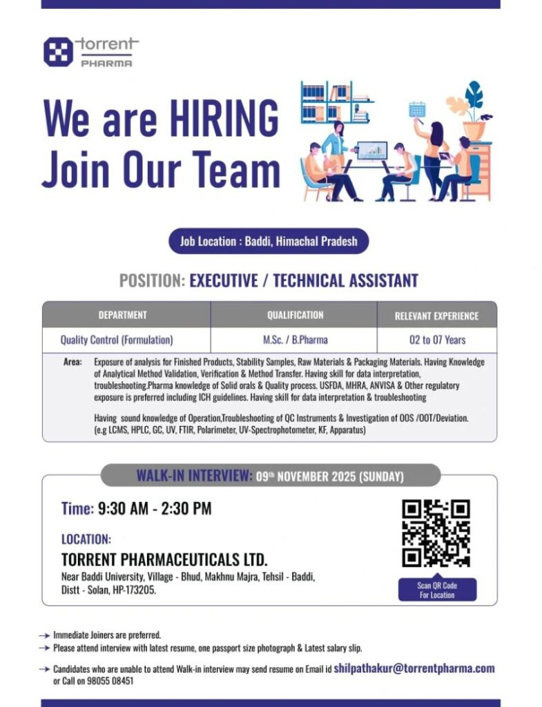 Torrent Pharmaceuticals Ltd, a leading name in the pharmaceutical industry, is hiring Executives / Technical Assistants for its Quality Control (Formulation) department at its Baddi facility.