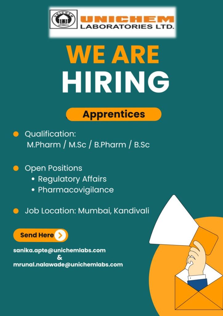 Unichem Laboratories Ltd. is a trusted name in the pharmaceutical industry with a strong presence in both domestic and international markets. Known for its high-quality manufacturing, research capabilities, and commitment to compliance, Unichem provides excellent opportunities for young professionals to begin and grow their pharma careers. The organization is now inviting fresh and talented graduates to join as Apprentices in key functional areas.