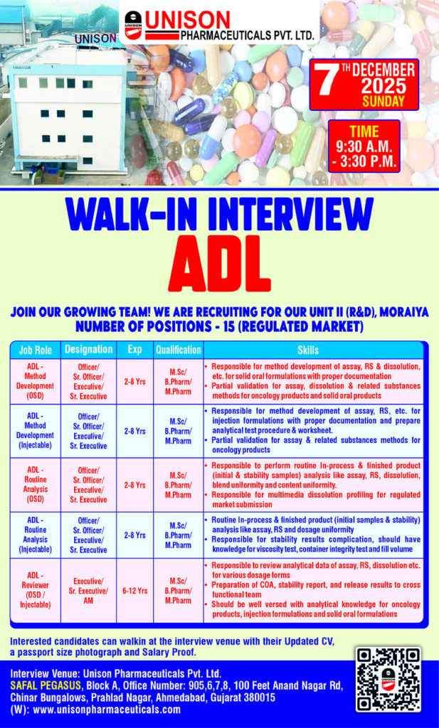 Unison Pharmaceuticals Pvt. Ltd., a reputed name in the pharmaceutical industry, is committed to delivering high-quality and affordable medicines across regulated markets. With modern R&D facilities and strong analytical capabilities, Unison continues to expand its scientific workforce. The organization is now hiring for multiple ADL positions for its Unit II (R&D), Moraiya, aiming to strengthen analytical research for solid oral and injectable formulations.