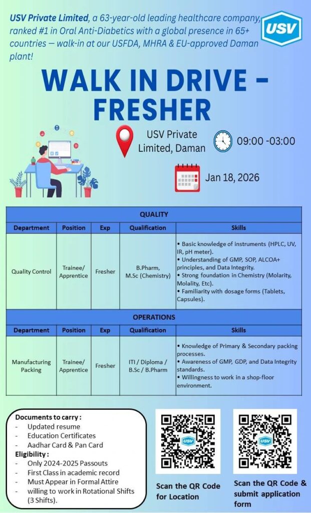 USV Private Limited is a 63-year-old leading healthcare company and a global pharmaceutical player with presence in more than 65 countries. USV is ranked among the top companies in Oral Anti-Diabetics and operates world-class manufacturing facilities approved by USFDA, MHRA, and EU authorities. The company is known for its strong compliance culture, quality-driven operations, and employee-focused work environment.