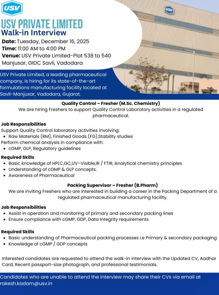 USV Private Limited – Walk-In Interview For Quality Control & Packing Department on 16 December 2025