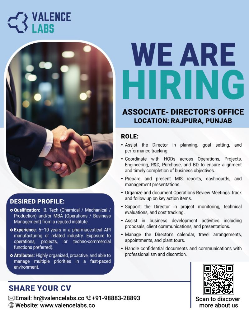 - Experience: 5–10 years in pharmaceutical API manufacturing or related industry, with exposure to operations, projects, or techno-commercial roles.