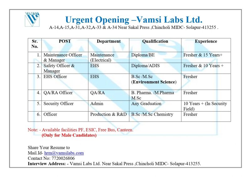 Mail ID: hrm@vamsilabs.com