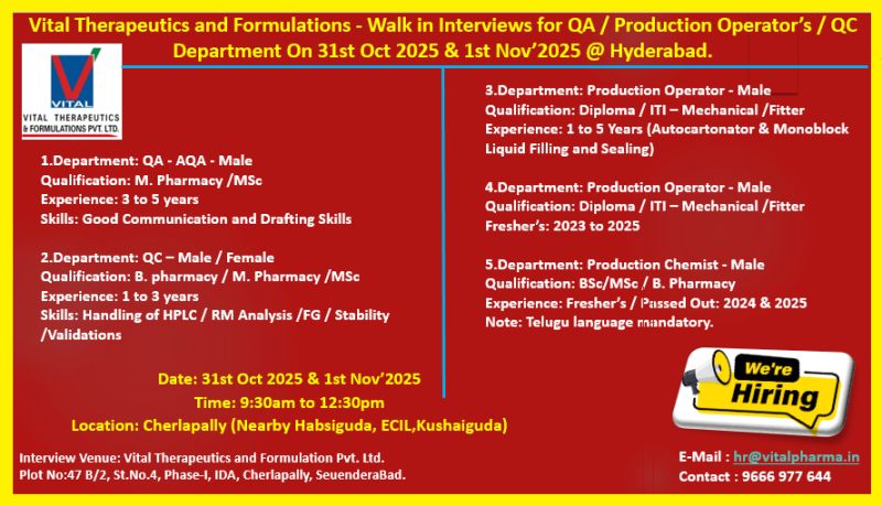 Vital Therapeutics and Formulations Pvt. Ltd is a reputed pharmaceutical company known for its strong presence in manufacturing and formulation development. The company is conducting Walk-in Interviews for various positions in QA, QC, and Production departments at Hyderabad.