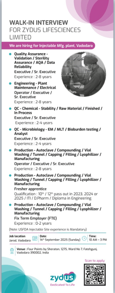 Zydus Lifesciences Limited, a leading name in the pharmaceutical industry, is hiring for multiple positions at its Injectable Manufacturing Plant, Vadodara. The company invites candidates with relevant pharma experience to attend the Walk-In Interview.